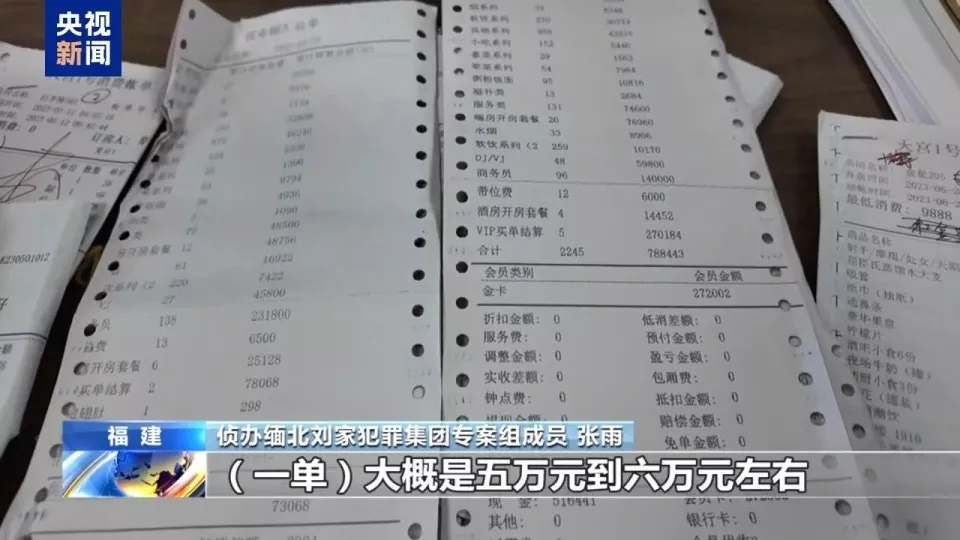 侦办缅北刘家犯罪集团专案组成员 张雨:平均每晚消费一单5万到6万元左右,每日营收60万元左右。从他的营业汇总来看,比如2023年6月25日,他当天营收了678000元。这些只是不包括吸毒的日常消费,每一项他在其中都能赚到钱。