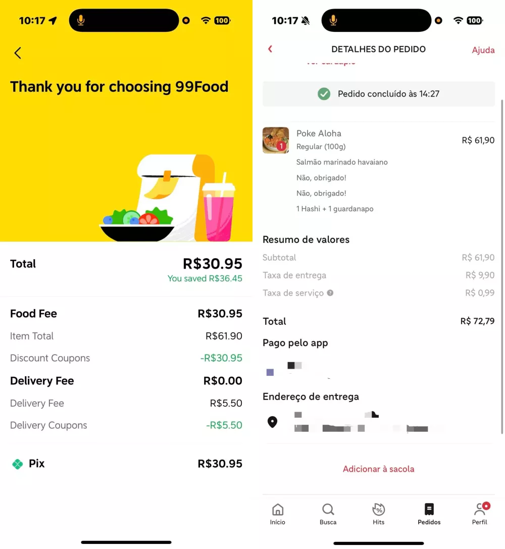 我们接触到了多位巴西当地华人,并请他们通过iFood和99Food分别下单,在巴西的同一家餐厅购买几乎相同的菜品以控制变量,而后进行两个平台的点单体验对比。