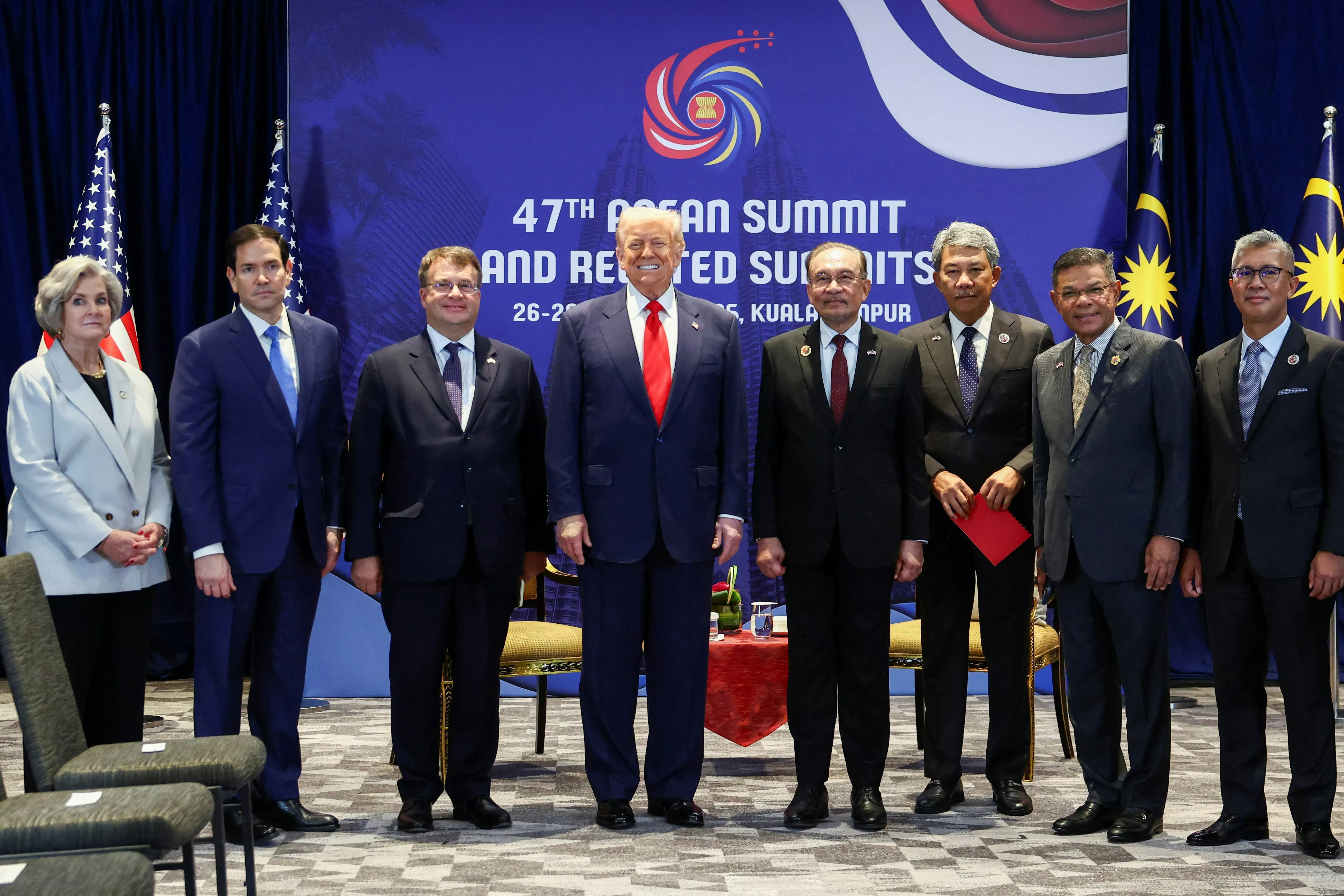 2025年10月26日,马来西亚吉隆坡,图为川普在东盟峰会上与一众东南亚领导人合影。(Reuters)