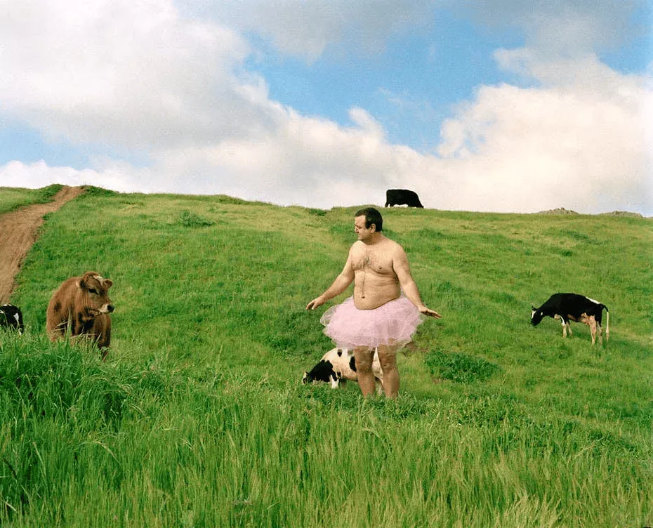 目睹了妻子遭受乳腺癌化疗的痛苦后,美国摄影师鲍勃·凯里披上粉色蓬蓬裙拍摄了一系列“芭蕾舞女”主题照片。镜头里,凯里沉重的、不“完美”躯体与轻盈的纱裙碰撞,解构了传统概念中的所谓“美丽”。