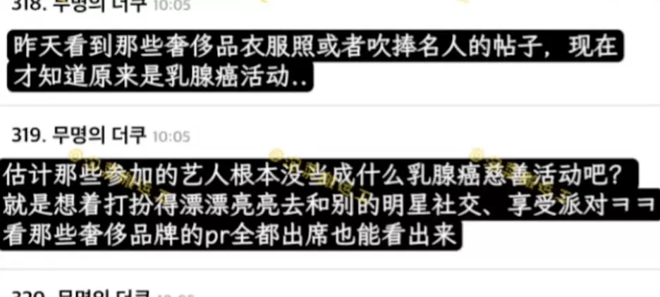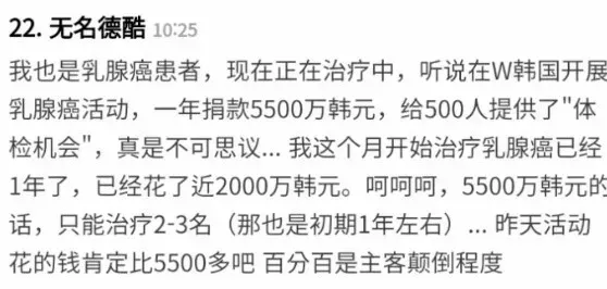 这样一场声势浩大的慈善晚宴,集顶级富豪和顶流明星于一堂,最终只为乳腺癌患者募集到了1.5亿韩元(约合人民币74.2万)的善款,但根据韩国网友的现身说法,自己治疗乳腺癌仅一年的费用就高达2000万韩元。