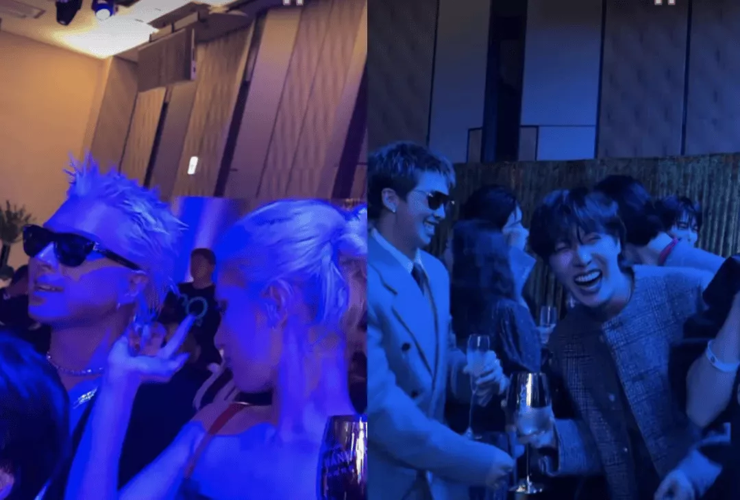 现场星光熠熠,堪称一场大型KPOP盛会。韩娱圈叫得上名字的男团女团成员,防弹少年团金南俊、郑号锡、金泰亨,女团ASEPA全员,IVE张元英、安佑真悉数到场,一群俊男靓女身着昂贵的晚礼服,伴着现场奢华迷醉的灯光和音乐,推杯换盏,气氛热烈。