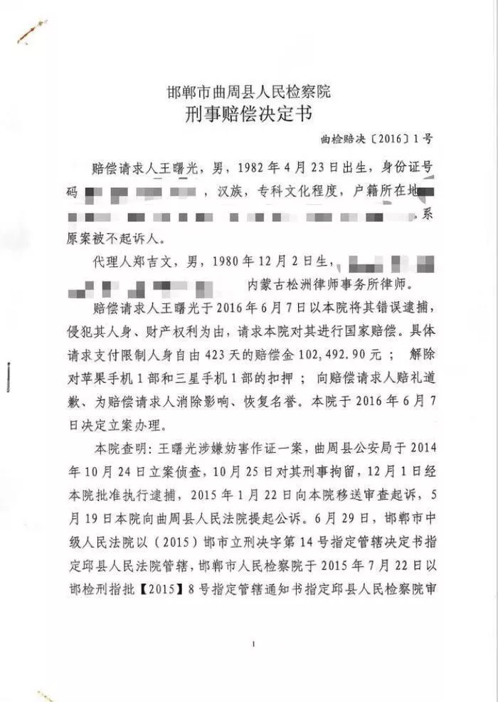 王曙光被释放后回到海南,2016年4月,他委托代理律师向曲周县检察院提出国家赔偿申请。曲周县检察院收到王曙光及律师提交的国家赔偿申请材料后,一直未受理,王曙光再次信访、申诉。经河北省检察院、河北省涉法涉诉服务中心督办,曲周县检察院于2016年6月决定受理王曙光提出的国家赔偿申请。同年8月6日,曲周县检察院刑事赔偿决定书显示,王曙光于2016年6月7日以曲周县检察院将其错误逮捕,侵犯人身、财产权利为由,请求该院对其进行国家赔偿,具体请求支付限制人身自由423天的赔偿金102492.90元;向赔偿请求人赔礼道歉、为赔偿请求人消除影响、恢复名誉。曲周县检察院认为,赔偿案审理期间,曲周县公安局对原案进行了重新补充侦查,认定其犯罪事实清楚,证据确实充分,并提出了移送审查起诉意见。赔偿请求人请求的赔偿侵权事项事实不存在,决定对王曙光的赔偿请求不予赔偿。此后,王曙光向邯郸市检察院提出赔偿复议申请,2016年10月11日,邯郸市检察院作出刑事赔偿复议决定,支持他的刑事赔偿请求。