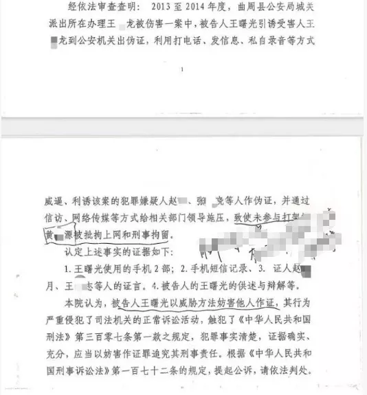 然而,2014年10月25日,曲周县公安局突然以涉嫌“妨害作证罪”将王曙光刑事拘留,同年12月1日王曙光被曲周县检察院批准逮捕,后移交法院审理。曲周县检察院起诉书显示:被告人王曙光引诱受害人王某龙到公安机关出伪证,利用打电话、发信息、私自录音等方式威逼、利诱该案的犯罪嫌疑人赵某等人作伪证,并通过信访、网络传媒等方式给相关部门领导施压,致使未参与打架的黄某源被批拘上网和刑事拘留。相关案件资料显示,2014年10月20日,黄某源因涉嫌故意伤害罪被曲周县公安局刑事拘留,10月24日被取保候审,直到2015年3月14日才被解除取保候审。曲周县公安局认定,因在侦查过程中发现黄某源没有参与殴打王某龙的行为,不够刑事处罚,2015年11月12日对其作出终止侦查的决定。