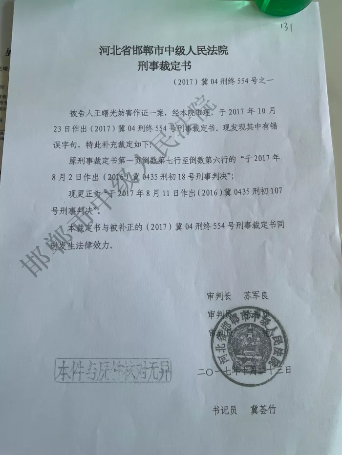 今年3月17日,河北高院出具补正通知书,并将原件邮寄给王曙光。4月19日,王曙光将自己的案情反映至中央巡视组,在中央巡视组督办下,邯郸中院仅向王曙光邮寄了补正文书复印件,至今仍未提供原件。
