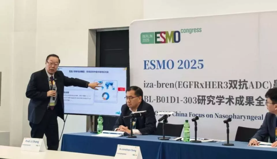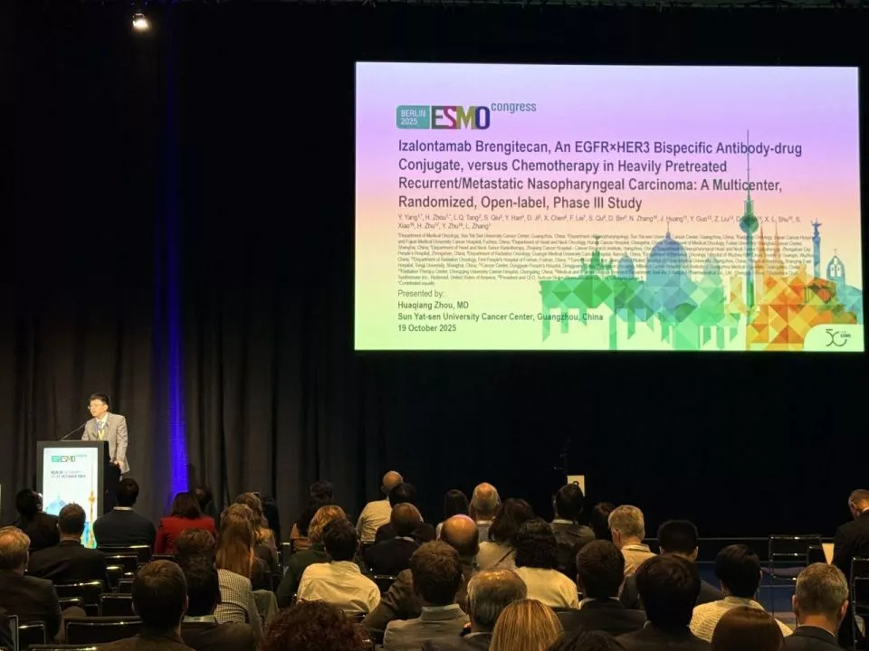 2025年10月19日,在欧洲肿瘤内科学会年会(ESMO)现场,周华强公布了研究的突破性成果:客观缓解率高达54.6%,中位无进展生存期达到8.38个月,疾病进展或者死亡风险下降了56%。“有效率比传统治疗翻了一倍,疾病控制时间也翻了一倍。这意味着,晚期鼻咽癌患者真正多了一条路。”