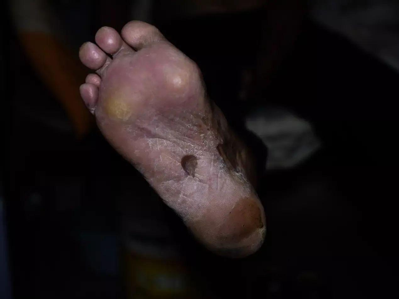 一位高龄打工者受伤的脚。在工地干活儿的人,踩到钉子、铁丝受伤,时有发生。