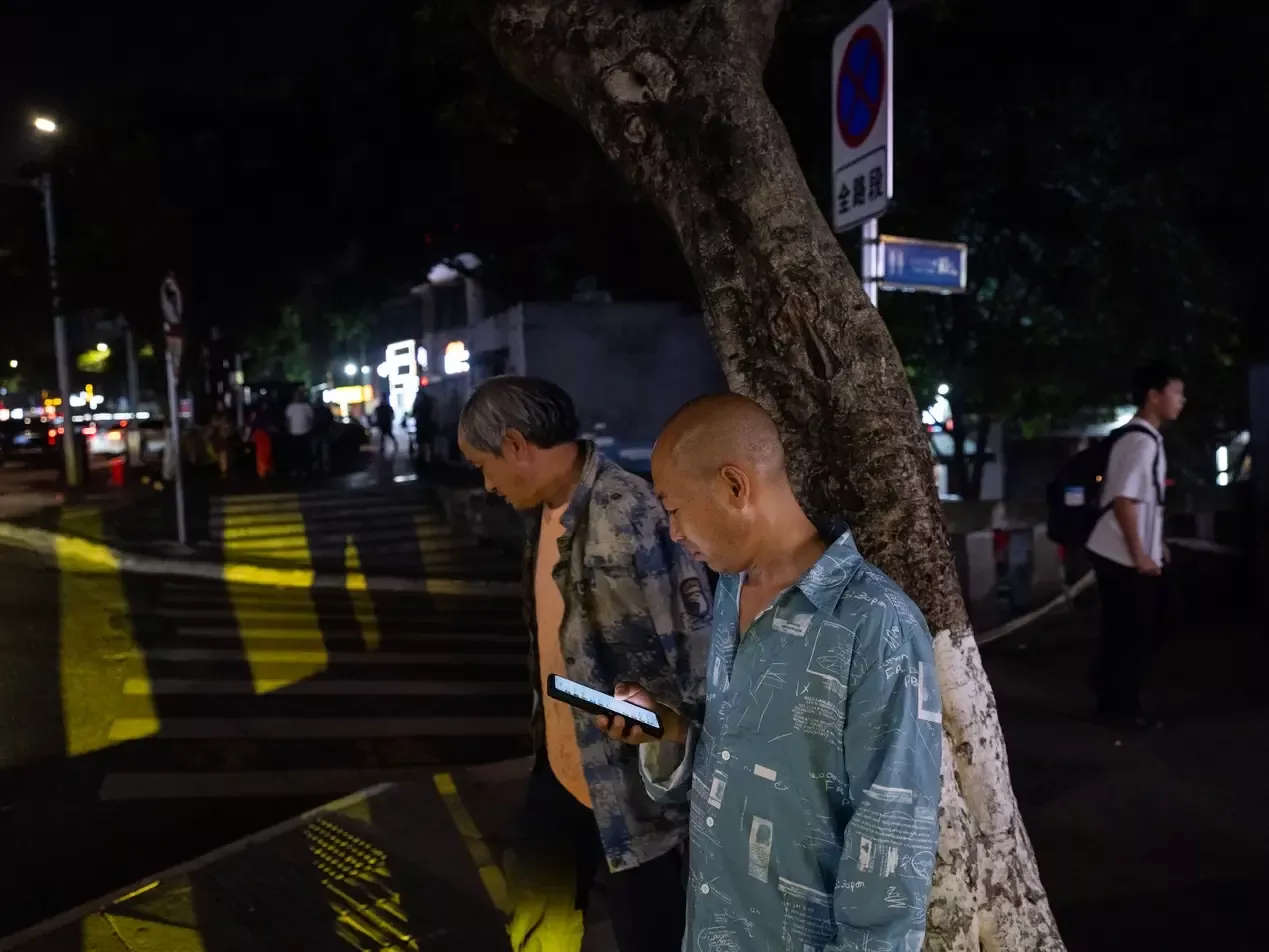 旅店里,用手机找工作的打工者。