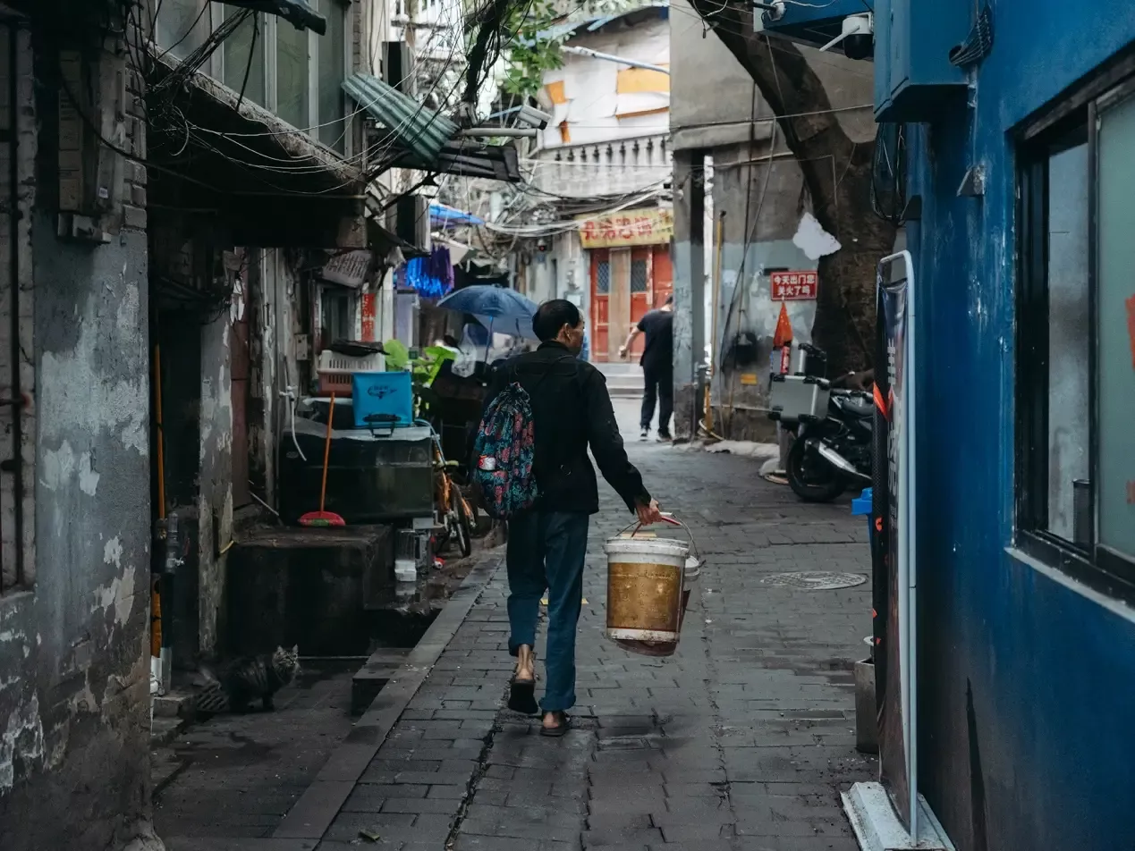 干完活儿的建筑工人走进巷子。