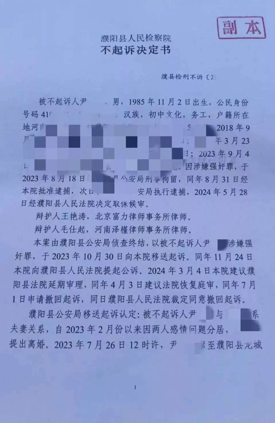 7月31日,濮阳县检察院出具《不起诉决定书》,本案现有证据不足,达不到起诉条件,决定不予起诉。