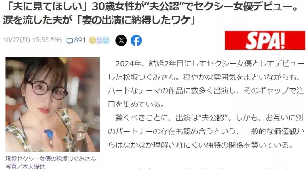 主角是一位30岁的普通女性,姑且叫她“松坂小姐”。她刚刚结婚两年,却在丈夫“点头同意”的情况下,选择了一个让人跌破眼镜的身份转变——成为成人女演员。