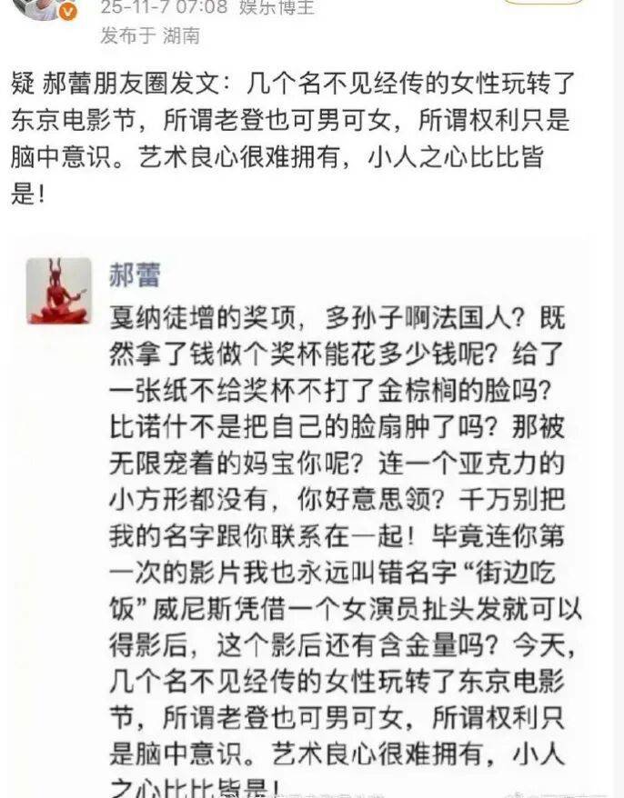 她指责东京电影节为“名不见经传的女性玩转电影节”,暗指评委文晏等操作奖项,感慨“艺术良心难寻,小人之心遍地”。