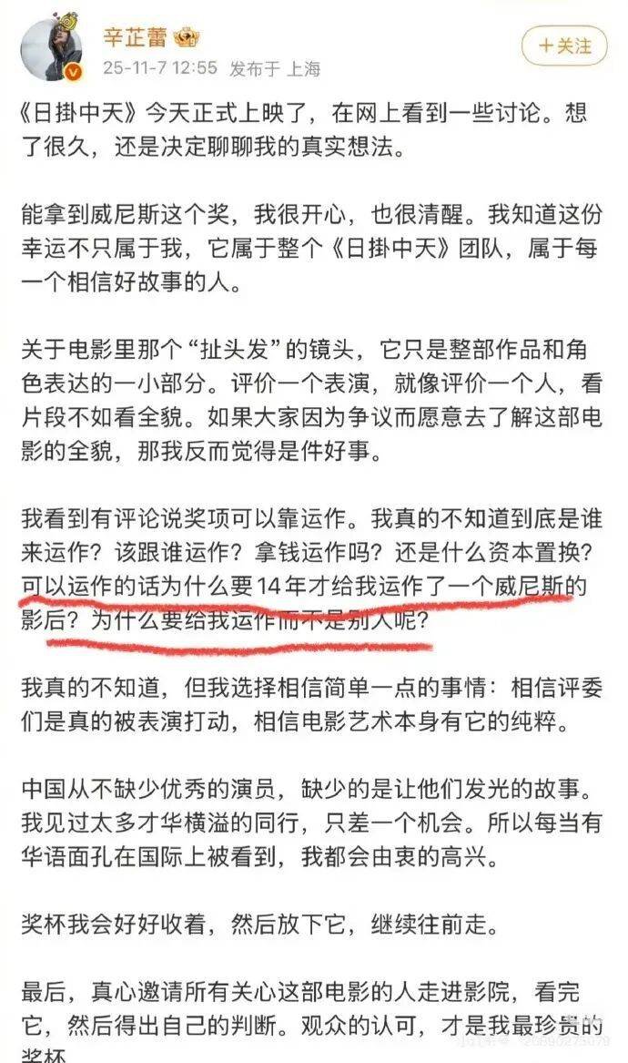 11月7日,辛芷蕾在电影《日掛中天》上映当天发布长文,通过六连问驳斥质疑。