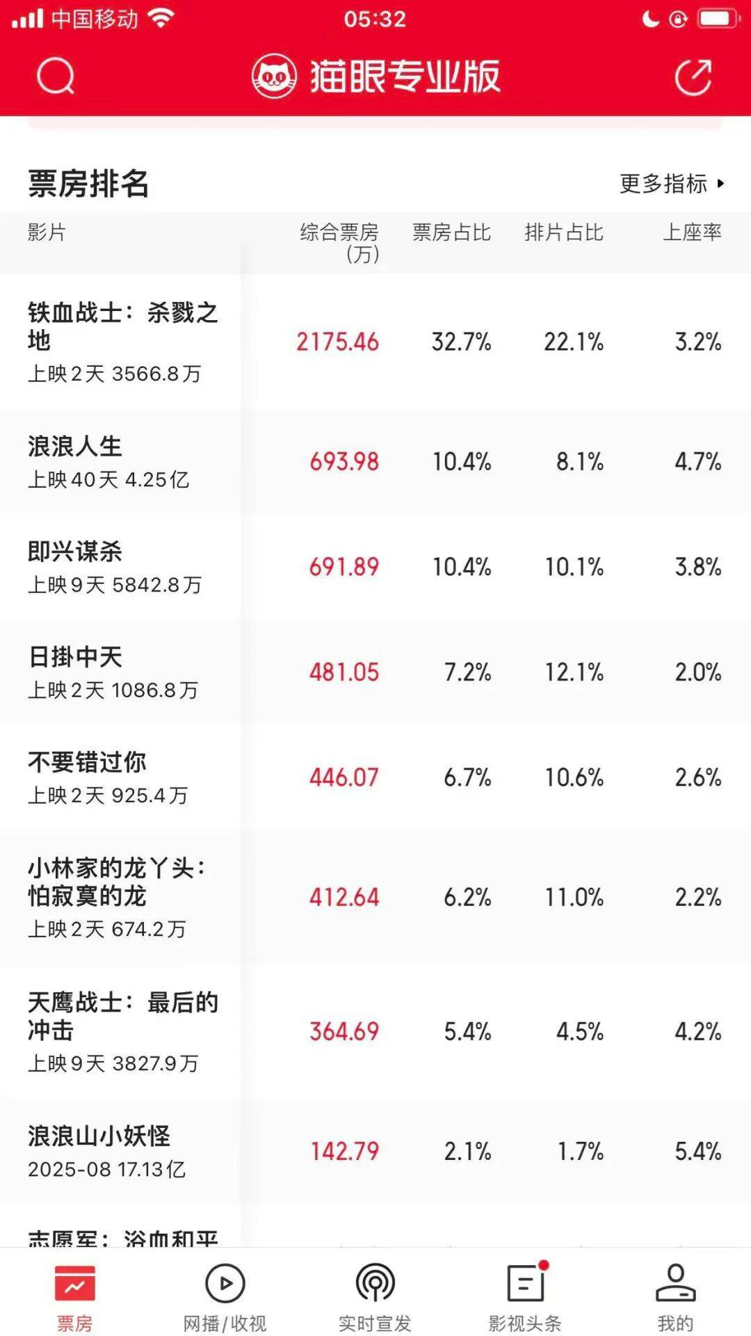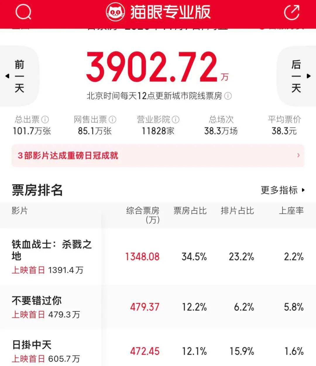 11月7日,《日掛中天》的综合票房仅为479万元,排片占比16.1%,仅次于美国大片《铁血战士:杀戮之地》,但票房贡献率却只有1.6%。