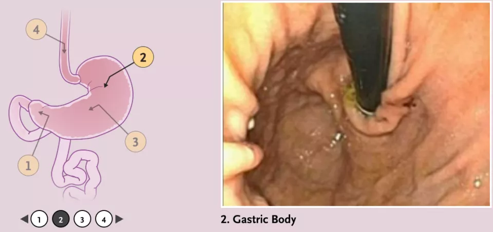 幸运的是,这位患者喝到第二天,腹部突然出现牵拉的感觉,然后不舒服迅速减轻了。复查胃镜时,胃石已经消失了。