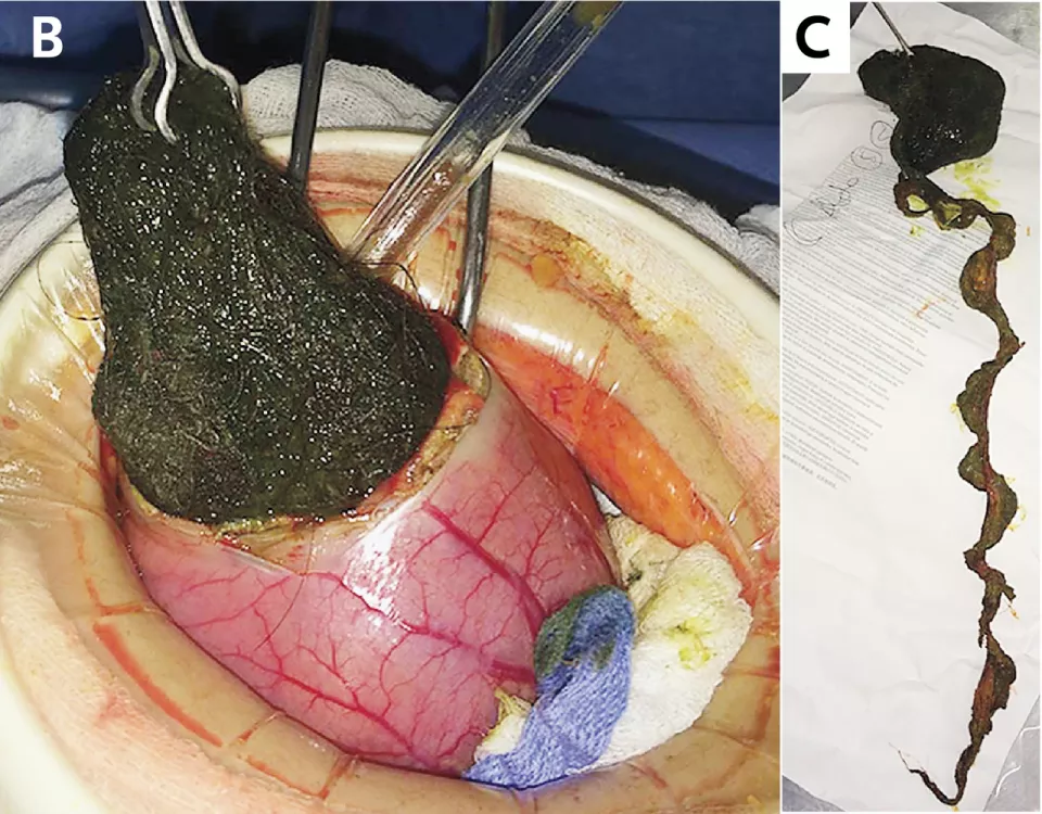 左滑查看更多图片:胃石示意图、手术中看到的毛发性胃石、CT检查中的胃石 | 参考文献[1]