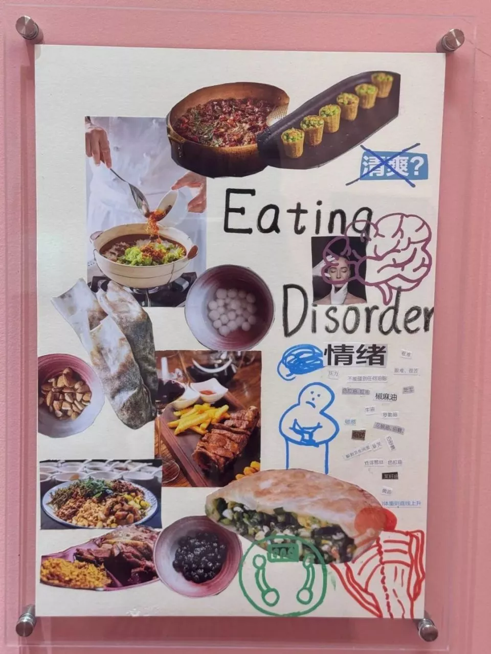 和佳佳一同观展的朋友也有类似的倾向。那位朋友在国外读了本硕,回到国内和父母待在一起,很不适应,继而有了进食问题,吃东西变得很困难。看到展里提到,有人在用进食试图夺回生活的控制权,她们才反应过来。此外,童年经历中的嘲笑或负面事件,同样会促使个体对自身形象产生过度关注。因此,进食障碍是一个多重因素交互作用的复杂问题。