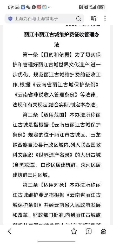 对于此事,上海邦信阳(武汉)律师事务所律师罗胜表示,《丽江市丽江古城维护费征收管理办法》中明确规定了游客去丽江古城以及大研古城(含黑龙潭)、白沙民居建筑群、束河民居建筑群三个区域才收取古城维护费。“它不合规,也不合法,因为游客根本就没有去这些区域。旅行社应该退回这笔费用。”