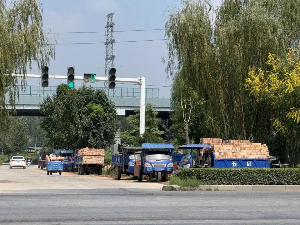 兰考县城边上的十字路口,车道崭新开阔,能并排放下四辆大卡车,人行道上立着一个坏掉的红绿灯。跨过马路,另一侧靠着农田的的路边并列排放十来辆大三轮车,车上整齐垒着红砖,三轮车驾驶座上大多没有主人,只在挡风玻璃前留下联系方式。