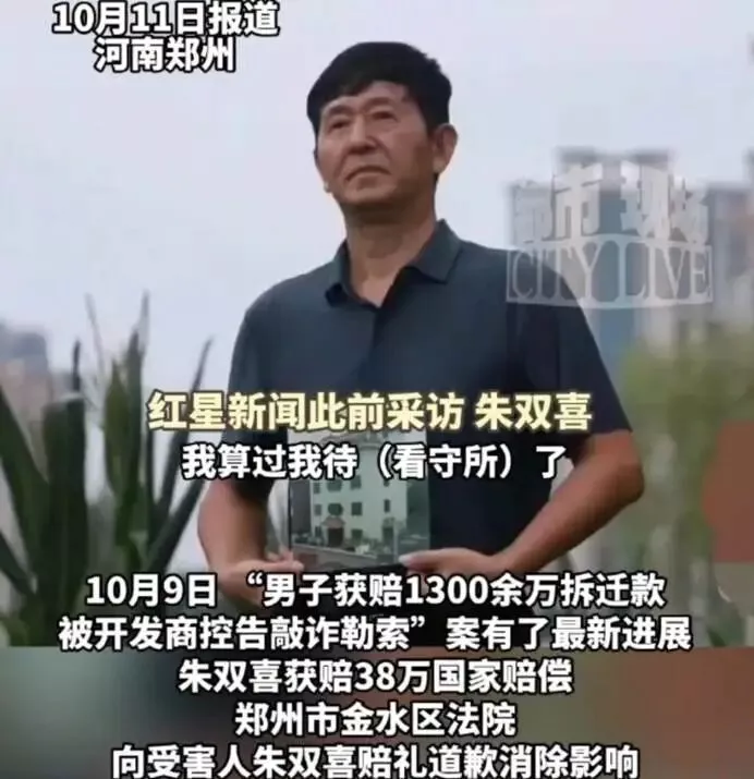 2025年10月9日,金水区法院出具《国家赔偿决定书》,决定赔偿朱双喜38万余元。法院同时承诺向他“消除影响,恢复名誉,赔礼道歉”。