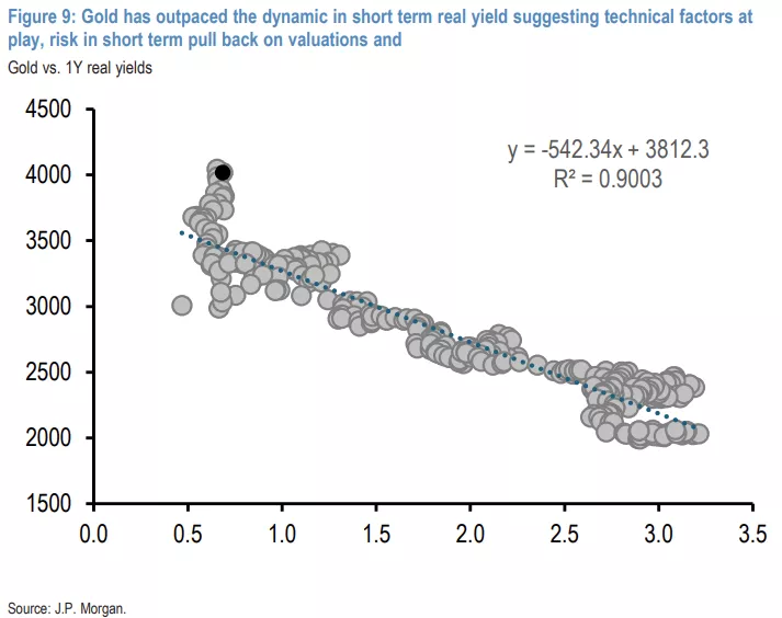 摩根大通指出,黄金近期的飙升已远超通常由一年期实际利率下降所能解释的涨幅。理论上,当其他"安全资产"的实际回报率下降时,黄金就变得更具吸引力。