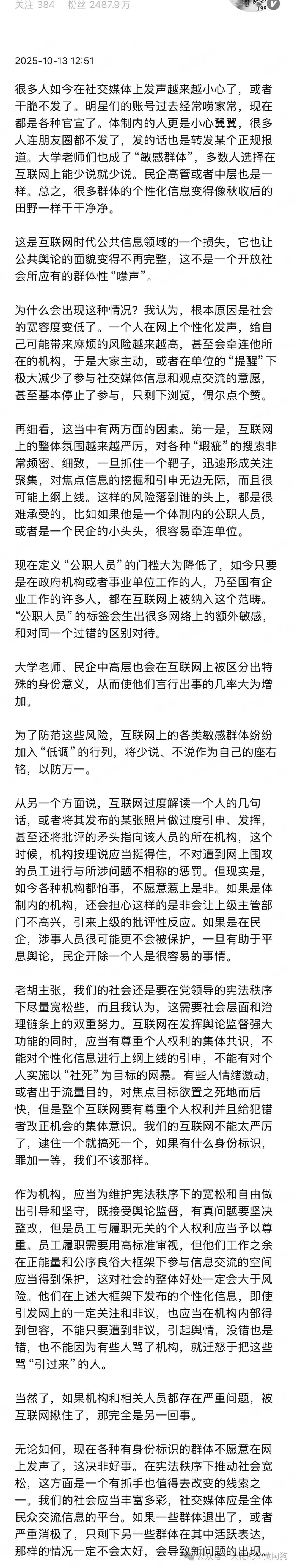 “很多人如今在社交媒体上发声越来越小心了或者干脆不发了。这是互联网时代公共信息领域的一个损失,他认为根本原因是社会的宽容度变低了。一个人在网上个性化发声,给自己可能带来麻烦的风险越来越高,甚至会牵连他所在的机构,于是大家主动,或者在单位的“提醒”下极大减少了参与社交媒体信息和观点交流的意愿,这当中有两方面的因素,首先是互联网上的整体氛围越来越严厉,而且很可能上纲上线。另一个方面说,互联网过度解读一个人的几句话,或者将其发布的某张照片做过度引申、发挥,甚至还将批评的矛头指向该人员的所在机构,各种机构都怕事,不愿意惹上是非。无论是公有或者私有的单位,都不会保护你。