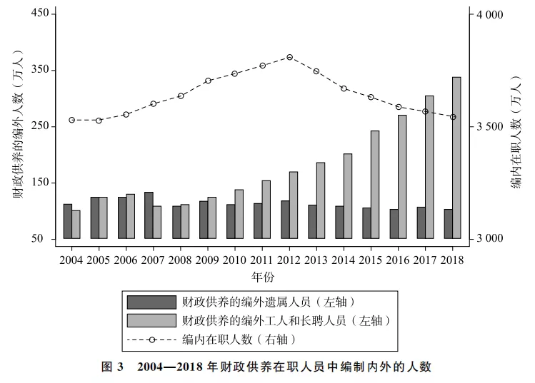 2004年全国编外人员才215万,到2018年就飙升到442万,翻了一倍还多。这些人不占编制,但工资照样得财政出。