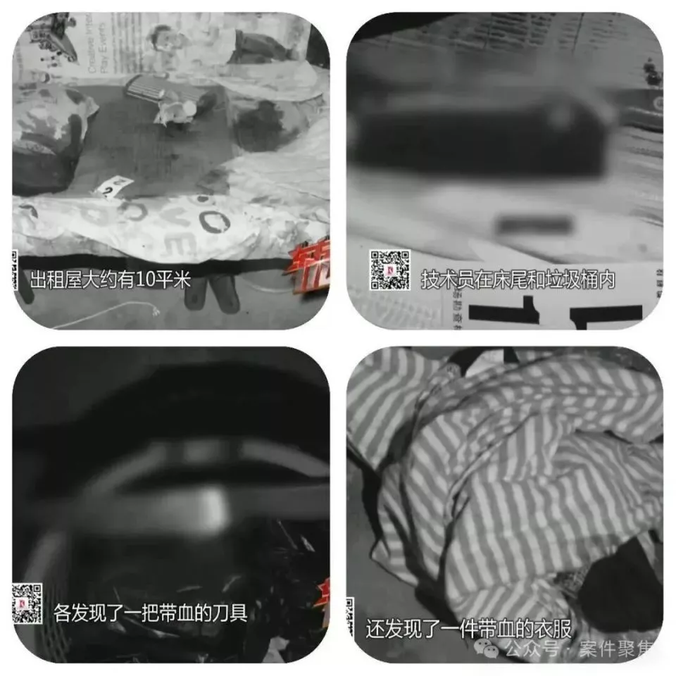 床尾和垃圾桶里各留有一把带血刀具,公用水斗处有一团带血的衣服。