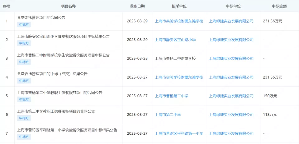 前不久涉事上海学生餐风波的“上海绿捷实业发展有限公司”,就是一家拥有十余年历史的老牌餐饮公司。它成立于2014年,后来发展为上海市中小学生最大的营养餐供应企业,仅在2025年8月一个月内就密集中标27个项目,覆盖全市16个区的500多所学校,日供餐超50万份,是一个妥妥的“中标”大户。