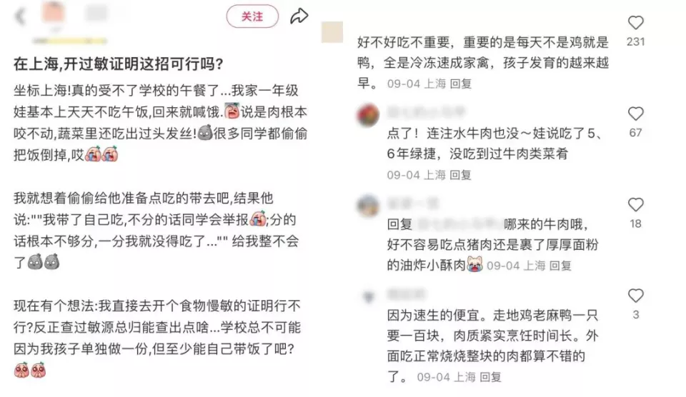 社交平台上有学生家长想要通过开过敏证明的方式让自己的孩子带饭/社交媒体截图