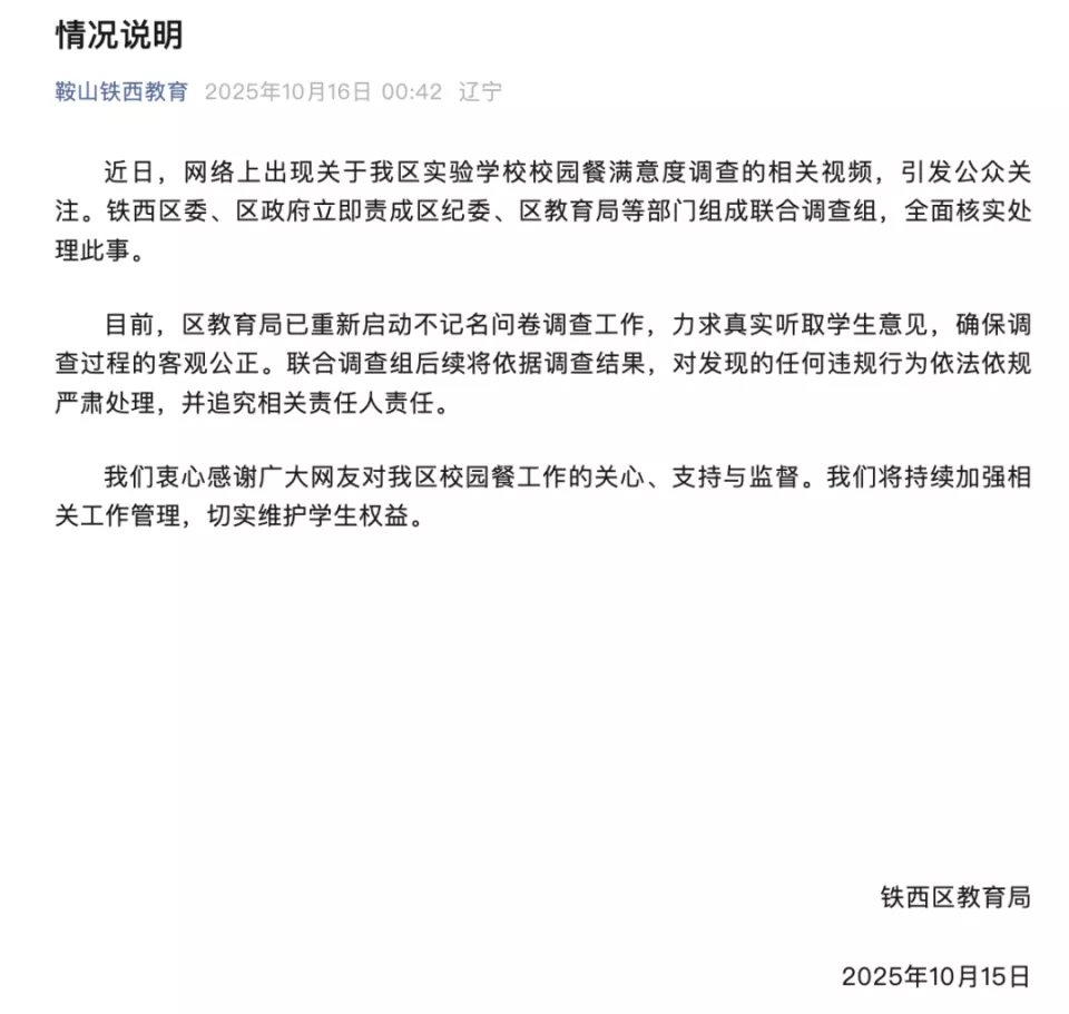 10月15日,铁西区教育局就此事作出回应:铁西区委、区政府立即责成区纪委、区教育局等部门已组成联合调查组,将全面核实处理此事。目前已重新启动不记名问卷调查工作,力求真实听取学生意见,确保调查过程的客观公正。联合调查组后续将依据调查结果,对发现的任何违规行为依法依规严肃处理,并追究相关责任人责任。