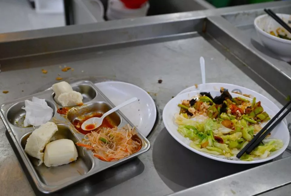 10月14日,在河南郑州某大学食堂收餐台上,餐盘里有不少剩饭剩菜/新华社记者郝源摄