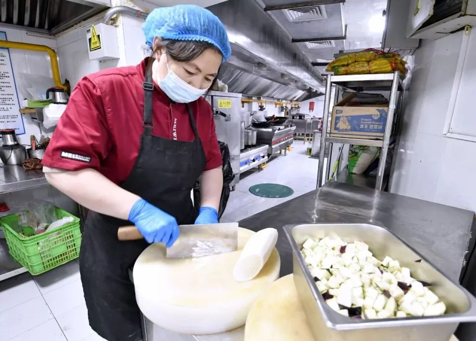 9月26日,朝阳区香河园街道中央厨房的厨师在准备制作午餐/新华社记者李欣摄