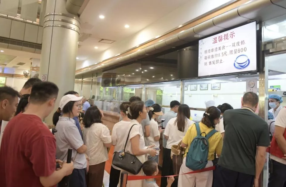 10月1日,市民游客在大院饭堂里排队选购餐食/新华社记者卢汉欣摄