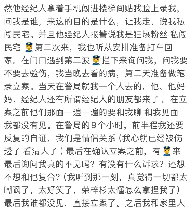 10月8日的纠纷中,李禹熹遭遇暴力殴打,所以报案了。而她称,荣梓杉方面为了污蔑自己是疯狂粉丝来骚扰,也报案了。