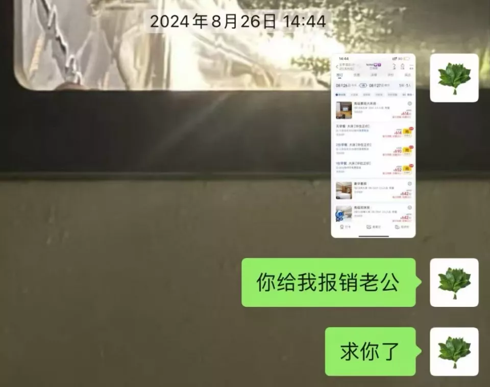 李禹熹一再强调需要报销,“老公大人”“求你了”,荣梓杉转了372元房间费用给李禹熹。
