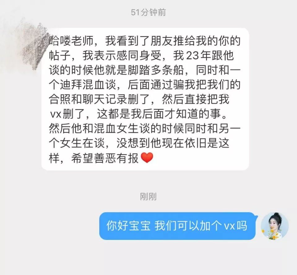 期间他对我态度非常好,说他一直喜欢我,哄我,我实在是放不下他,我发现失去他比原谅他重新建立信任更痛苦,所以我心软选择了后者。”“4月6号左右在他进组训练之前见了一次面,之后就为期半年没有见面,但他每天都给我打电话,或者小号天天联系。”