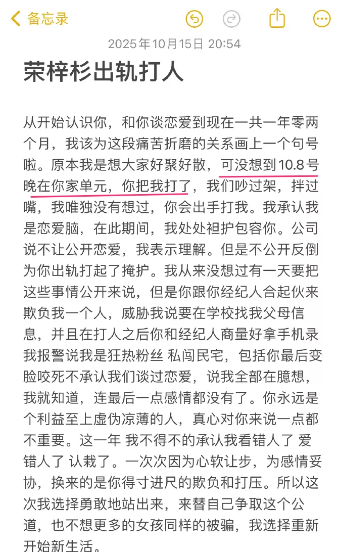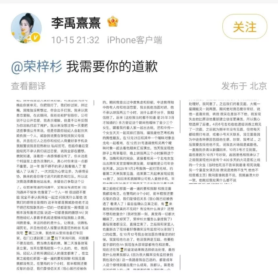 10月15日,女演员李禹熹(微博@李禹熹熹)发微博,指荣梓杉“出轨打人”。