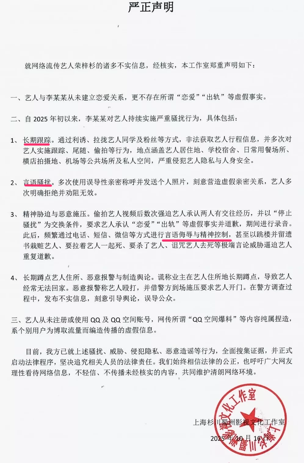 李禹熹发布长文的第二天(10月16日),荣梓杉工作室回应,称荣梓杉与李禹熹从不存在恋爱关系,也不存在出轨打人,指李禹熹(2025年中戏毕业,参与过冬奥会演出)长期跟踪骚扰荣梓杉,对荣梓杉进行“言语侮辱与精神控制”。