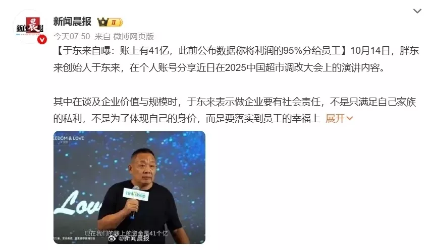 不过,于东来似乎很享受这种流量带来的关注度。最近,他又秀了一把,说公司没贷款,账上41亿,2025年销售额已经突破184亿,人均月薪超过1万元。这不是胖东来第一次晒员工工资了,感觉这个已经成为了一个流量密码。