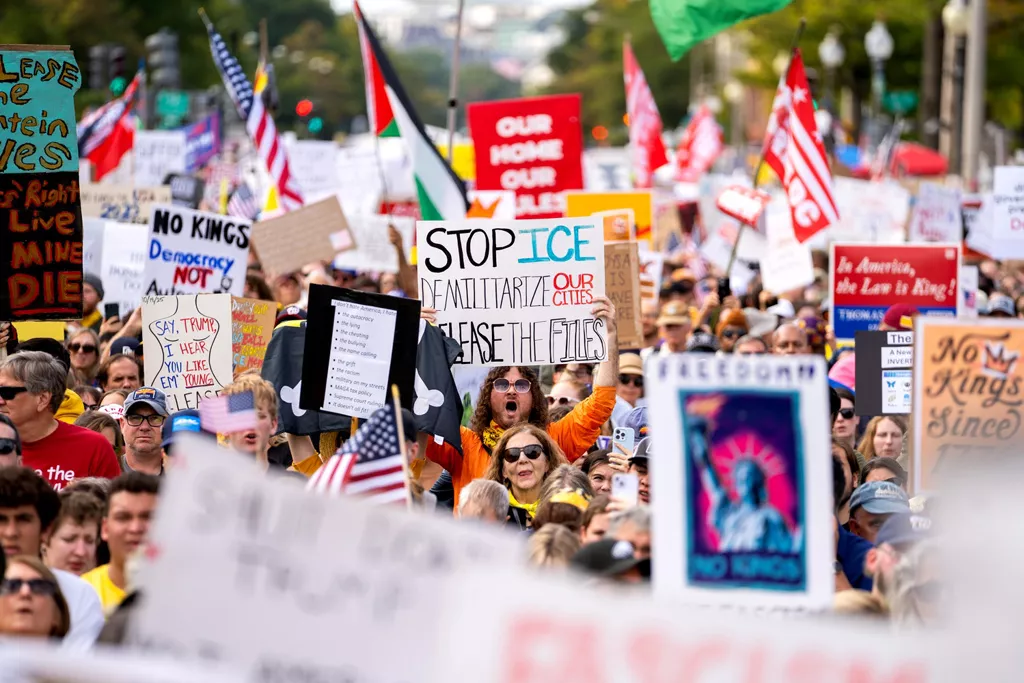 18日美国全国各地上演超过2600场“不要国王”(No Kings)示威。