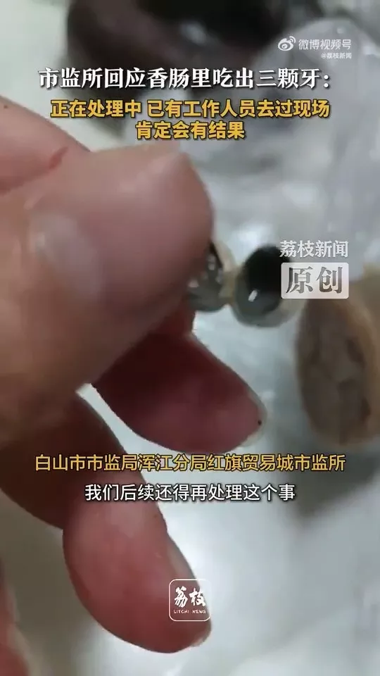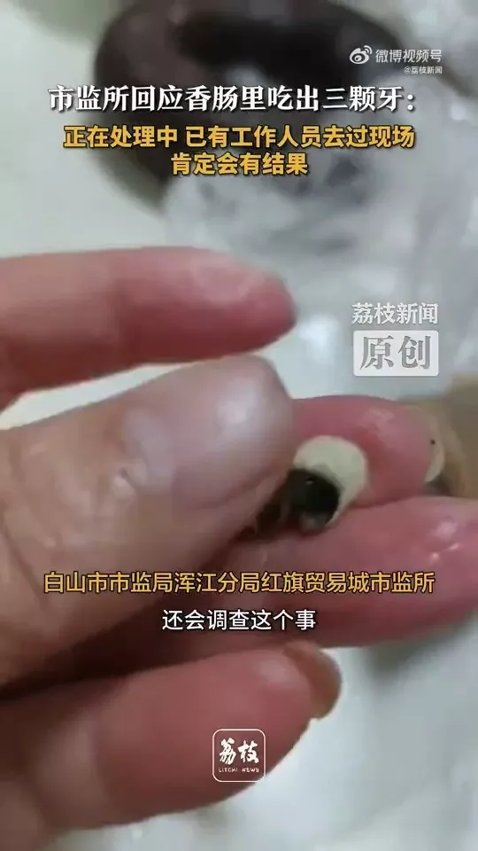 吉林白山市,一名民众近日在当地市场摊位购买香肠,食用时竟咬出疑似三颗牙齿的异物。(微博@荔枝新闻)
