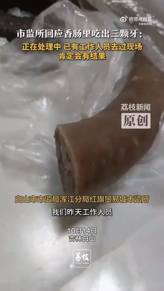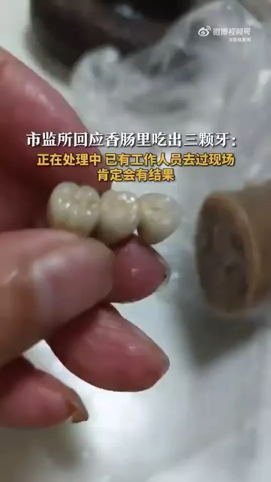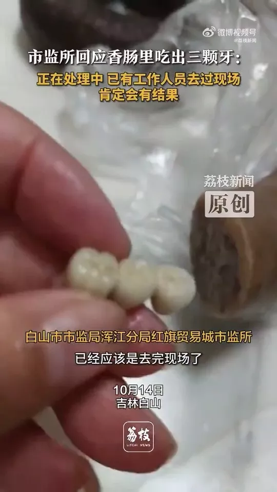 综合陆媒报导,吉林白山市一名民众近日在当地市场摊位购买香肠,食用时竟咬出疑似三颗牙齿的异物。当事人拍下视频并向市场监管单位举报。视频中可见,异物如同三颗完整白色牙齿,形状如臼齿且排列整齐。白山市市场监管局浑江分局红旗贸易城市监所回应指出,事件“正在处理中”。