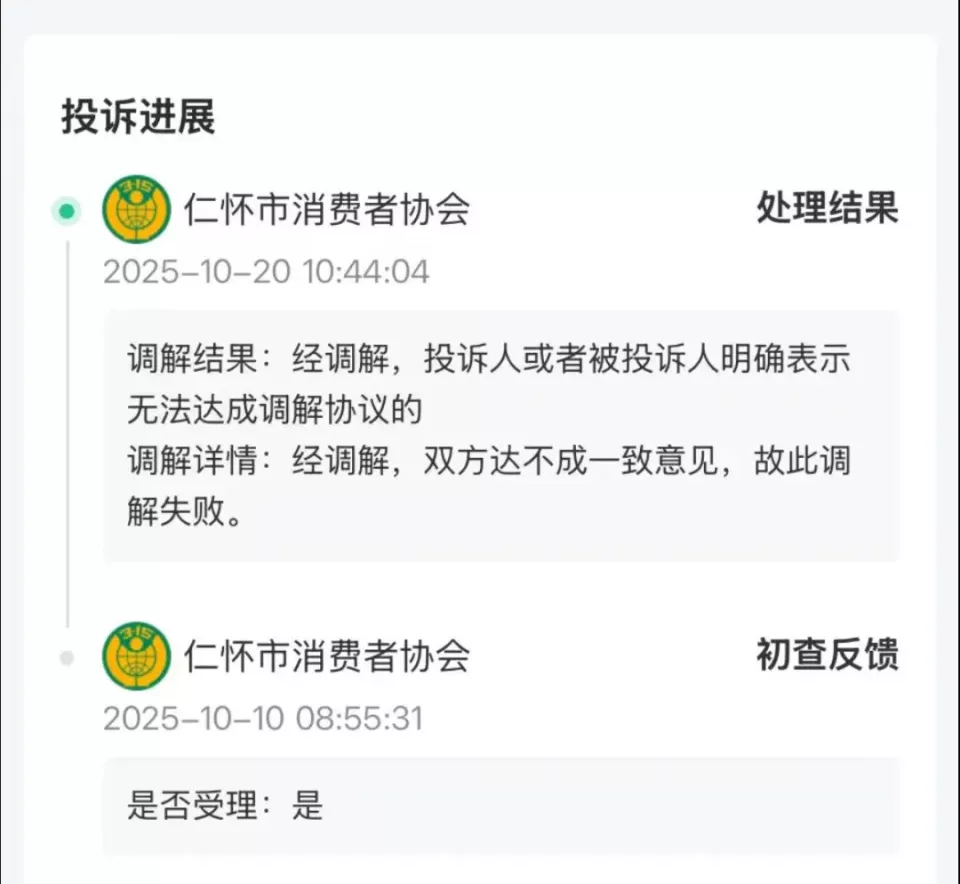 10月10日,系统显示仁怀市消费者协会受理;20日,仁怀市消费者协会反馈,经调解,投诉人或者被投诉人明确表示无法达成调解协议。