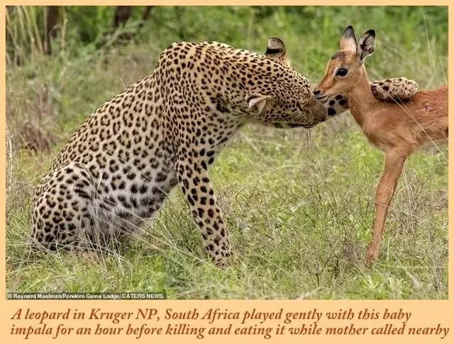 这张照片中,一只豹子把爪子搭在一只小黑斑羚的肩膀上,在小黑斑羚被它杀死之前,豹子陪它玩耍了一个多小时。沙赫里亚尔在豹子上方写着“我”,在小黑斑羚上方写着“一个迷路的可爱孩子”。