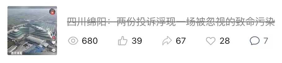 10月20日下午,一篇名为《四川绵阳:两份投诉浮现一场被忽视的致命污染》的文章出现在互联网上。它像一颗投入深潭的石子,本应激起层层涟漪,却在水面留下一个几乎无法察觉的痕迹后,便迅速沉底,消失无踪。文章的生命极其短暂,在仅仅获得了680个阅读量后,页面就变成了一行冰冷的红白提示:“此内容因违规无法查看。接相关投诉,此内容违反《互联网用户公众账号信息服务管理规定》”。