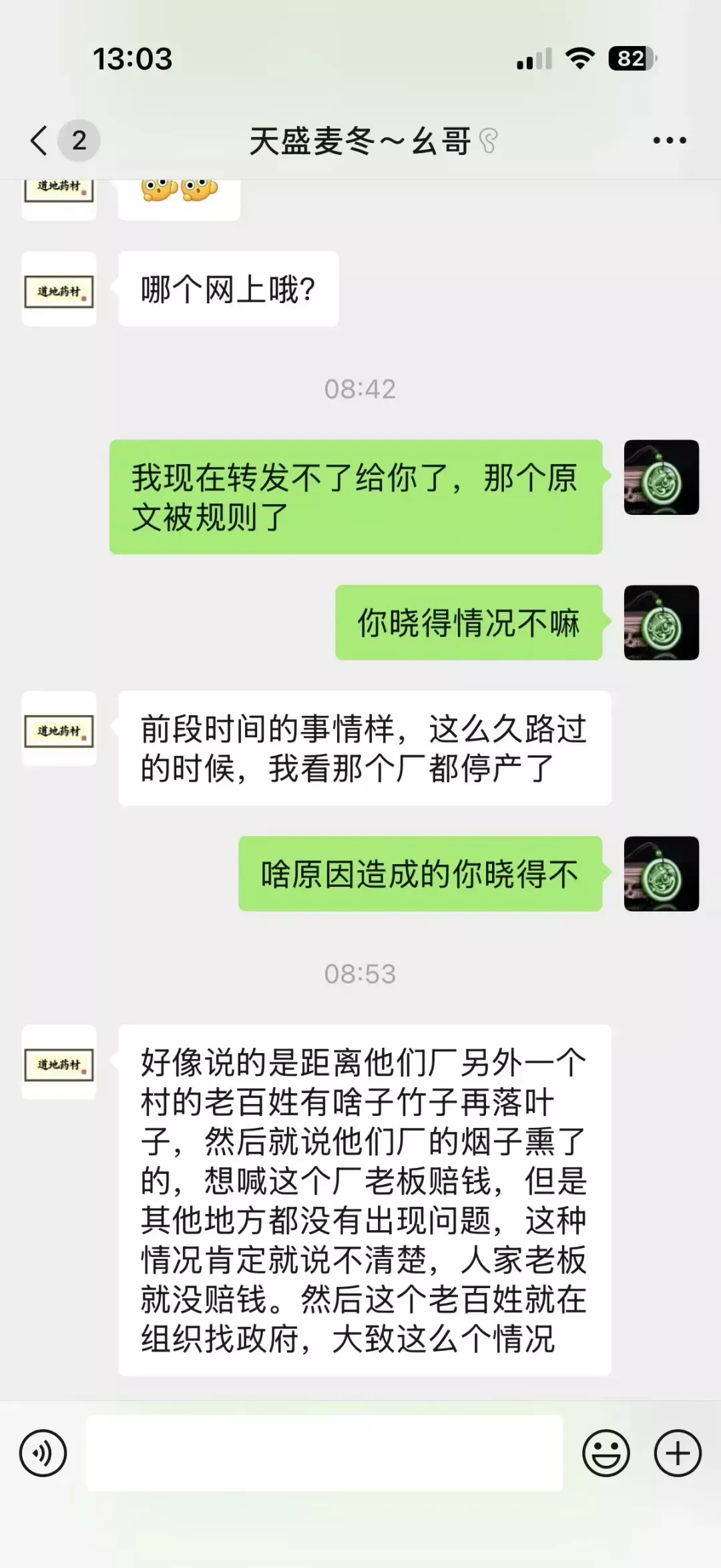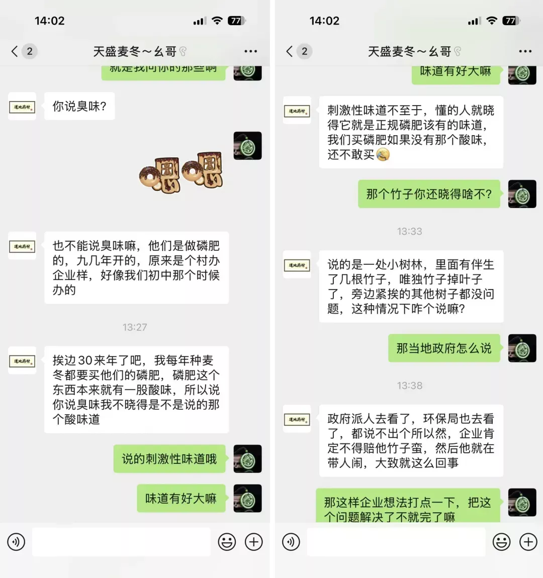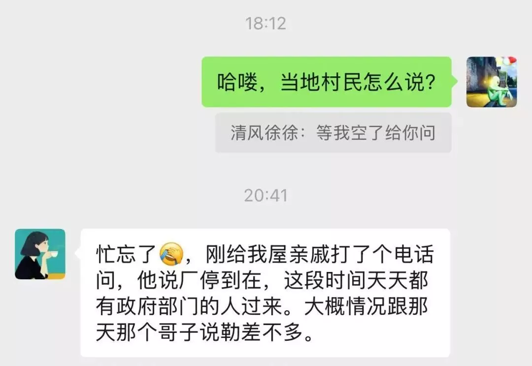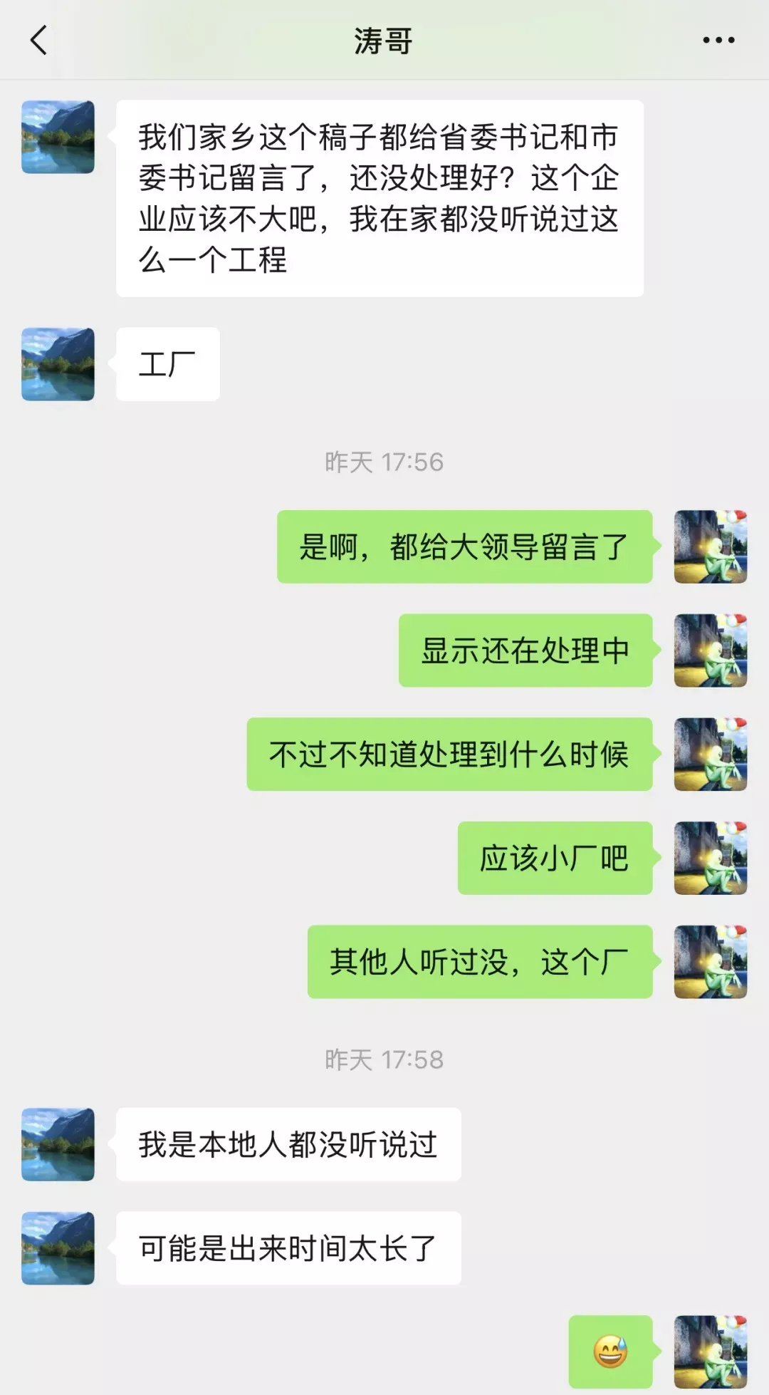 然而,当文章作者主动添加他为好友后,“涛哥”的人设变得可疑起来。在私聊中,他对着作者发出了截然相反的声明:“这个企业应该不大吧,我在家都没听说过这么一个工程(工厂)……我是本地人都没听说过”。
