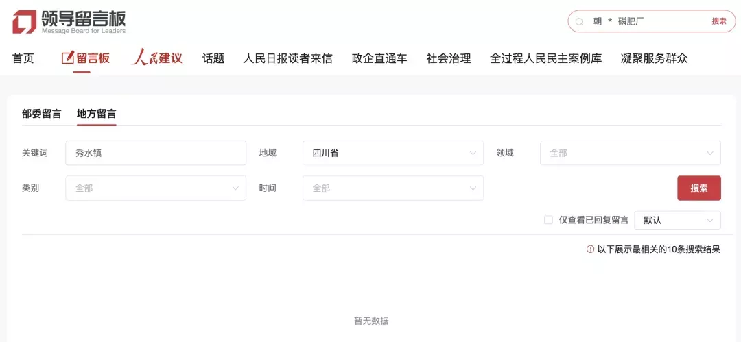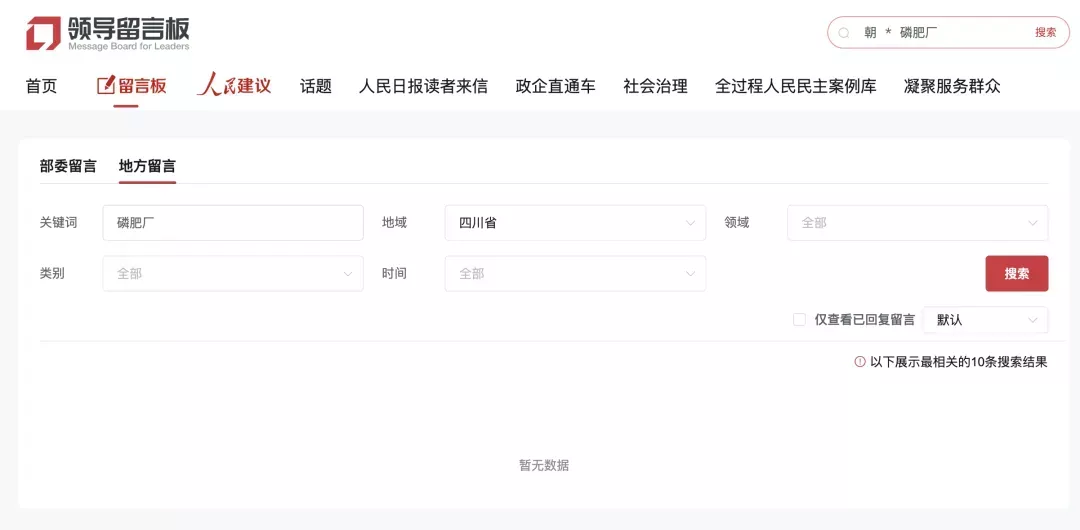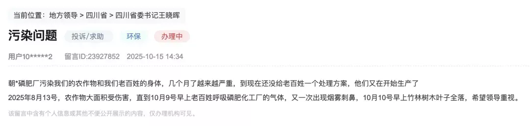 10月15日,ID“23927852”给四川省委书记王晓晖留言:“朝*磷肥厂污染我们的农作物和我们老百姓的身体,几个月了越来越严重,到现在还没给老百姓一个处理方案,他们又在开始生产了2025年8月13号,农作物大面积受伤害,直到10月9号早上老百姓呼吸磷肥化工厂的气体,又一次出现烟雾刺鼻,10月10号早上竹林树木叶子全落,希望领导重视。”