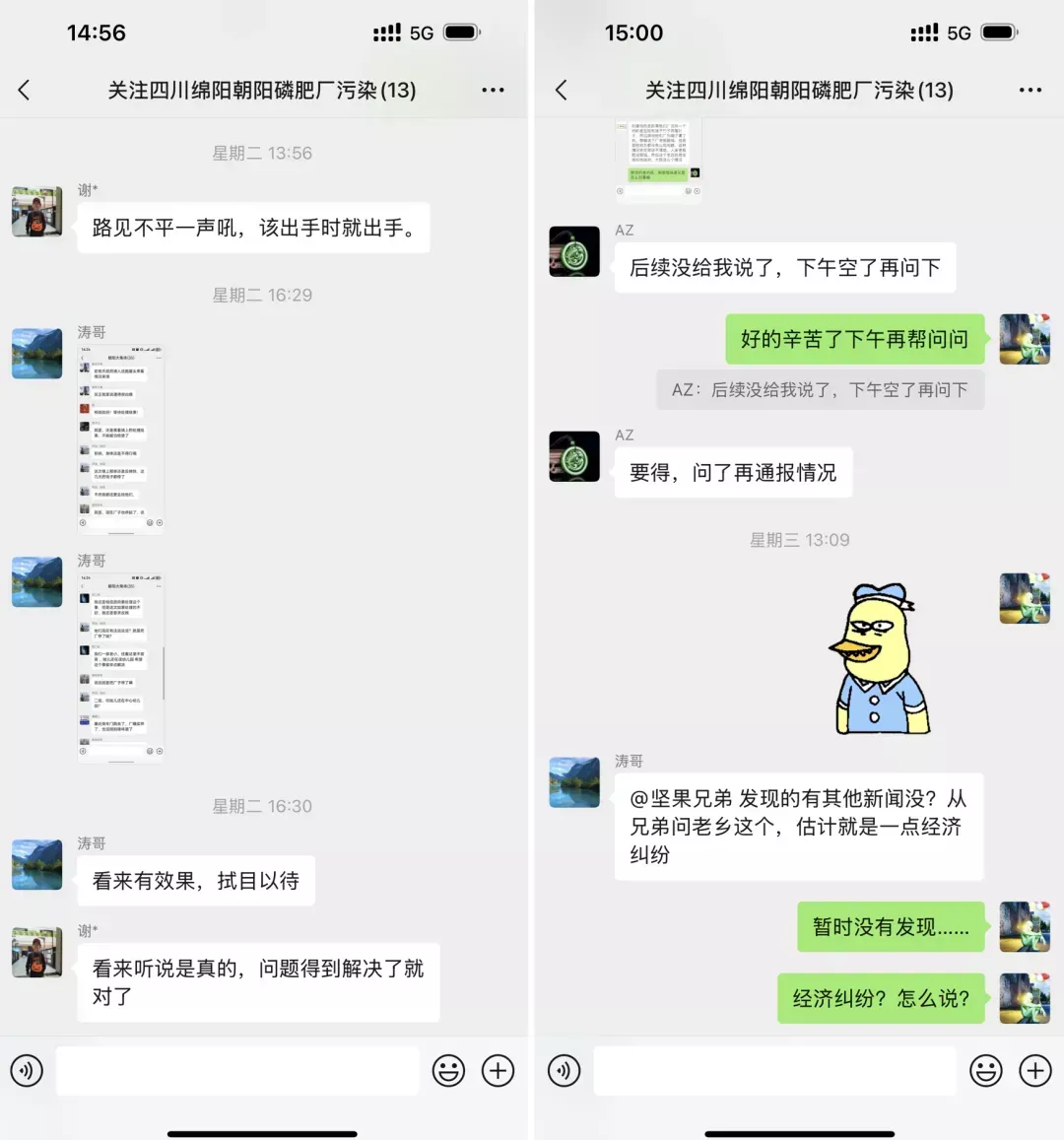 “涛哥”是群里最先活跃起来的角色之一。他最初的形象,是一个关心家乡环境的普通本地人。在被删除的文章下,他曾留下了一条评论,语气客观而关切:“如果真的有危险气体出来确实很危险。最近好像停产了?这几天没看到车辆出入”。这条留言将他塑造成一个细心观察的在地居民,他的话似乎为事件的严重性提供了旁证,又暗示情况可能已有所好转。