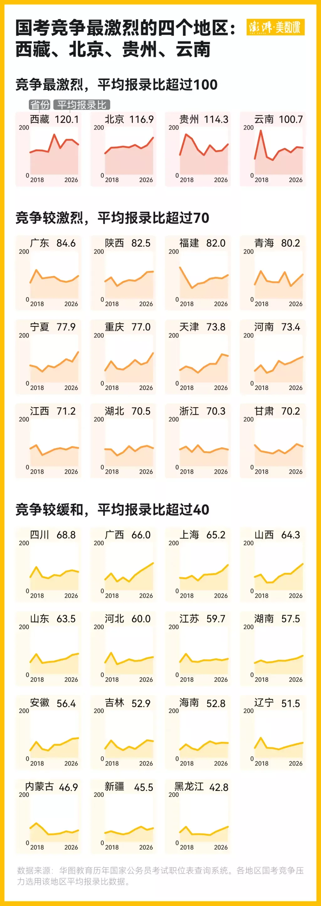 过去九年国考数据显示,近年来包括西藏、贵州、云南、广东、福建等地区的国考平均报录比虽然在波动中略微上升,但远低于历史峰值。